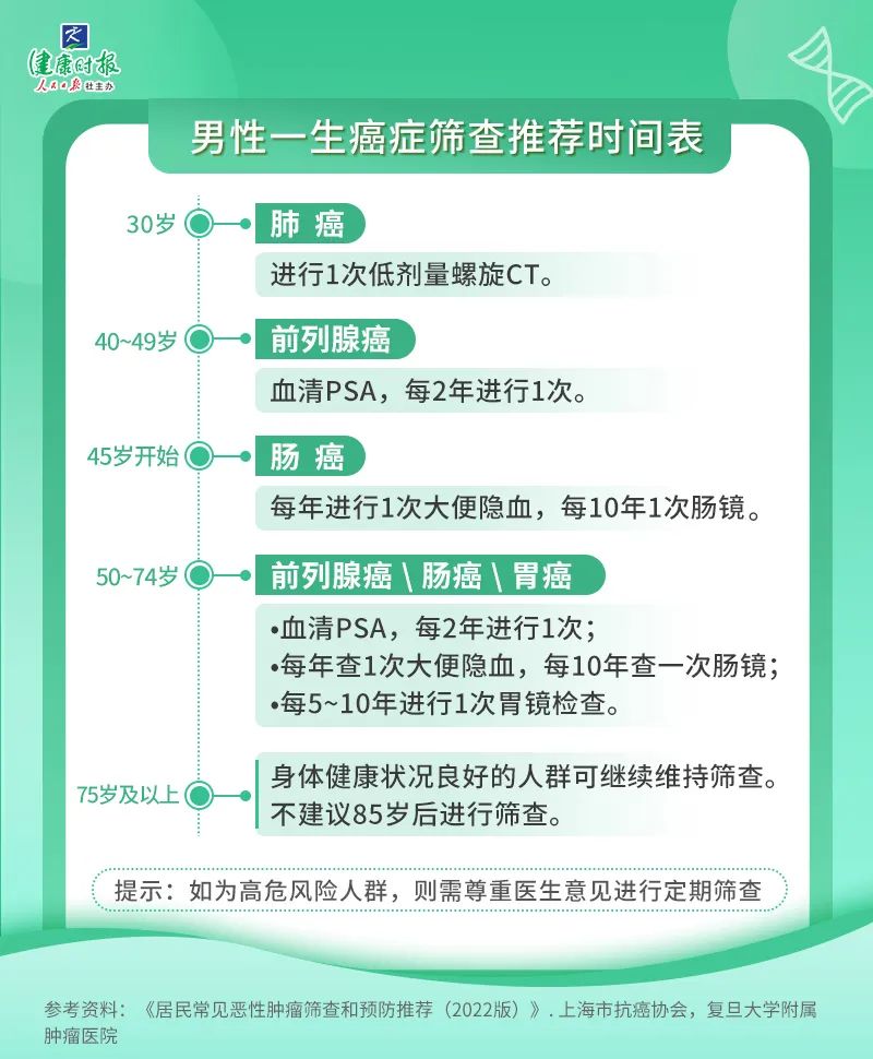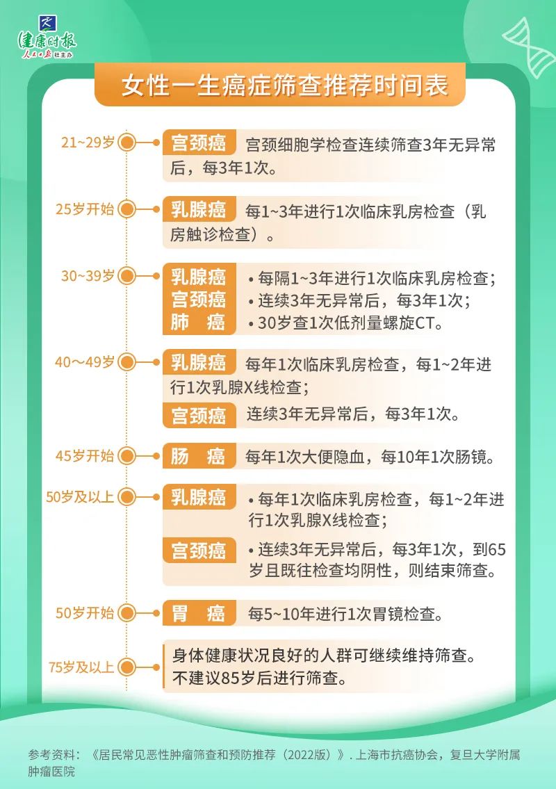 《居民常见恶性肿瘤筛查与预防推荐(2023版)》由上海市抗癌协会和复旦大学附属肿瘤医院联合发布,列出了我们在各个年龄段的“癌症筛查推荐时间表”。③