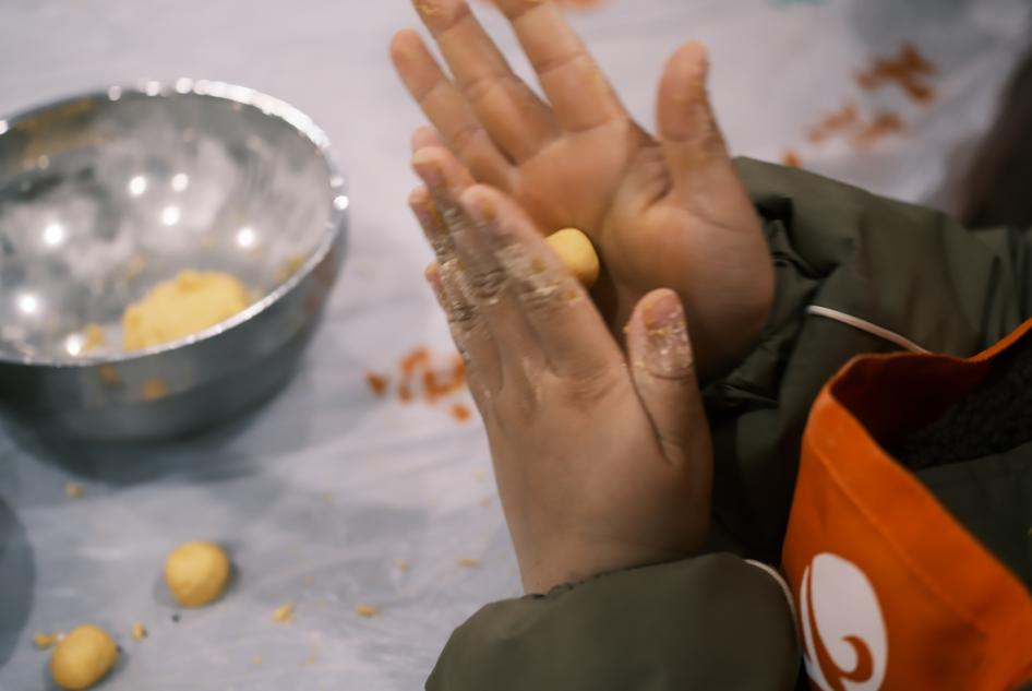 “我好像戴了黄色手套,完全被束缚了!”在制作过程中,南瓜泥的加入让面团非常舒服,秦学科的孩子忍不住说“求助”。“你应该边加南瓜泥边顺时针揉。”大师们一边演示一边鼓励孩子们。经过反复尝试,可爱的宝宝们终于成功地将面团揉成了一个圆圆的小圆圈。