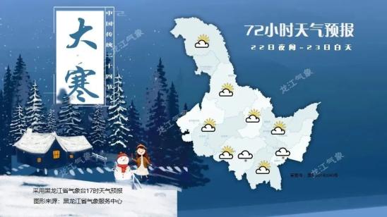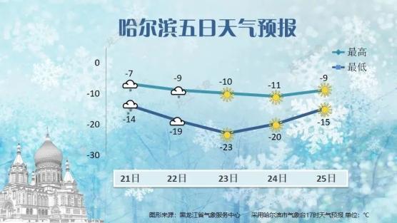 21日白天最高气温:大兴安岭北-16日~-14℃,大兴安岭南部,黑河,伊春,鹤岗,佳木斯-12℃~-10℃,牡丹江-5~-3℃,其他地区-9℃~-7℃。