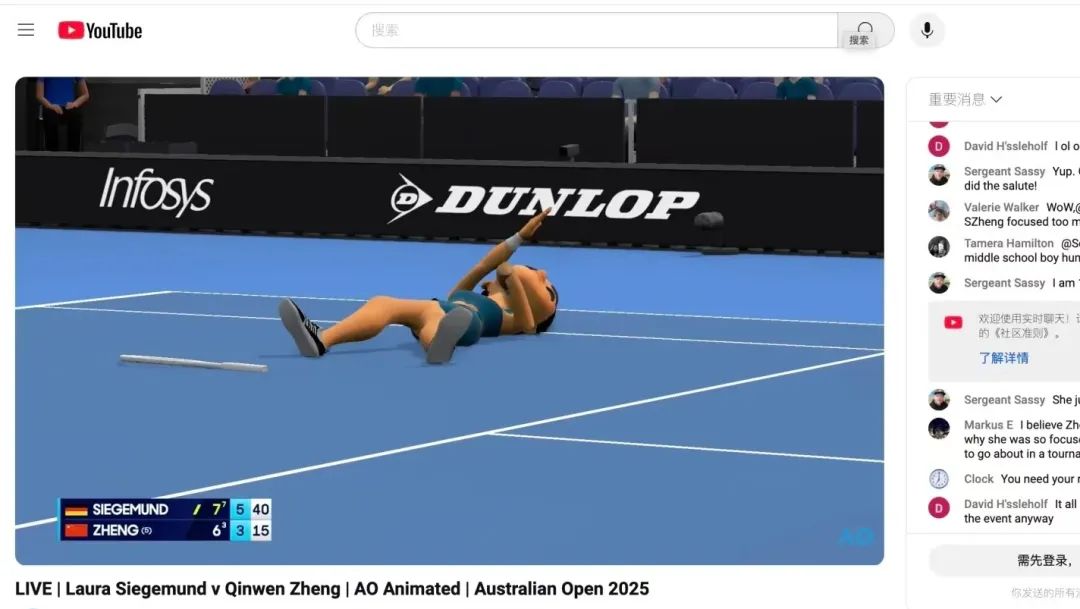 打开澳网YouTube频道的直播间,可以听到发球破空、球员鼓掌、球迷欢呼等声音。也有比赛讲解,但整个比赛画面就像一部3D动画。网友们高呼“为什么直播Switch游戏”和“全明星春节限制”。