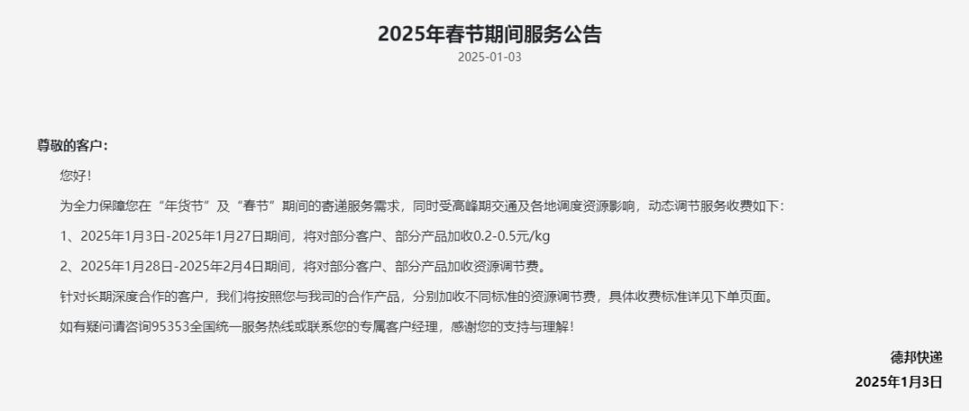 公告显示,德邦快递将动态调整服务费,以全力保障消费者在“年货节”和“春节”期间的送货服务需求。1月3日至1月27日,部分客户和部分产品将收取0.2元-0.5元/元。kg,一月二十八日至二月四日期间,部分客户、部分产品将收取资源调节费。