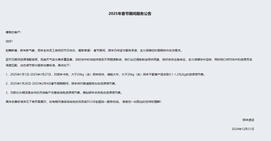 今年春节期间,我们将坚持服务保障,全力保障假期快递的接收需求。1月1日至1月27日,顺丰快递收取0.1元-1.2元/kg的资源调节费,包括顺丰快递、20kg以上顺丰快递、顺丰快递(含)快递、填舱大件、20kg以上顺丰快递等商品。1月28日至2月4日春节假期期间,顺丰快递将为送货服务增加资源调节费。