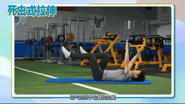 仰卧在地面上,肩膀和背部靠近路面。弯曲臀部和膝盖90度,双手伸直,指向天花板作为准备动作。吸气时放下右臂和左腿,呼气时回到起始位置,更换放下左臂和右腿。