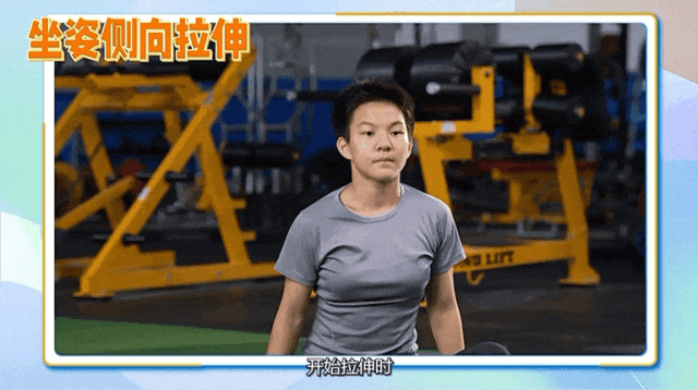 随着人体的侧屈,尽量靠近右耳,右身完全伸展到极限后,慢慢直立身体。向另一边,更换同样的拉伸运动。每组一侧做8-10次,每天做3组。