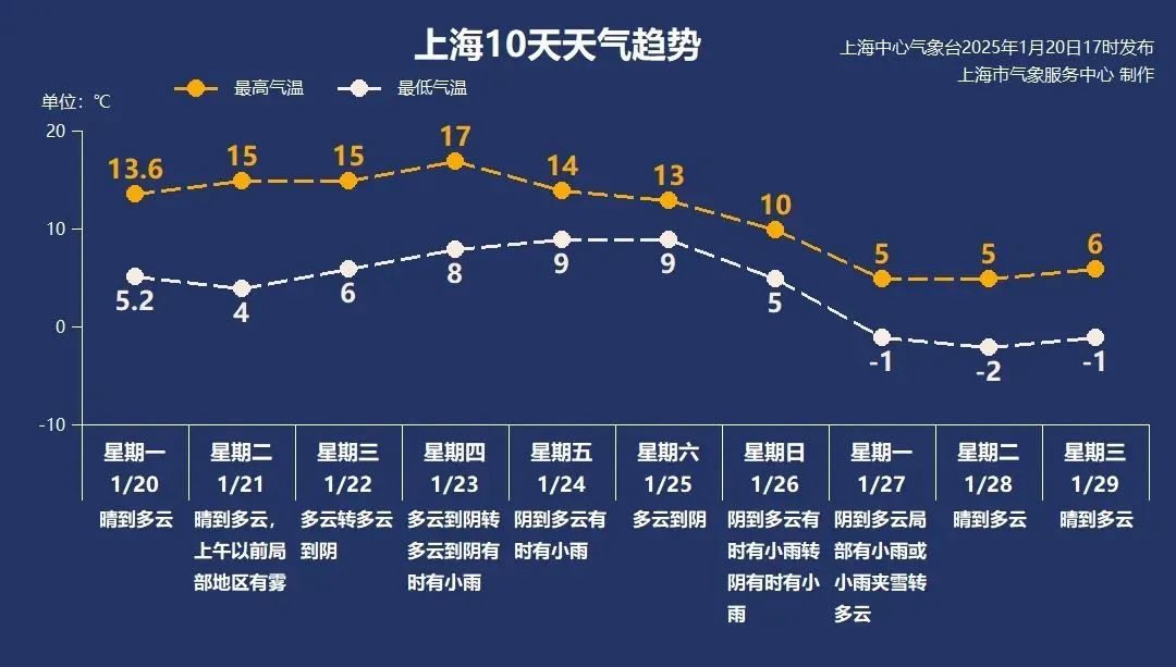 上海周三和周四主要是阴天,持续升温,周四最高气温甚至可以达到17℃。根据过去10年的气象数据,1月下旬的最高气温已经发生了三年。≥在17℃的情况下,2017年甚至达到21.5℃。
