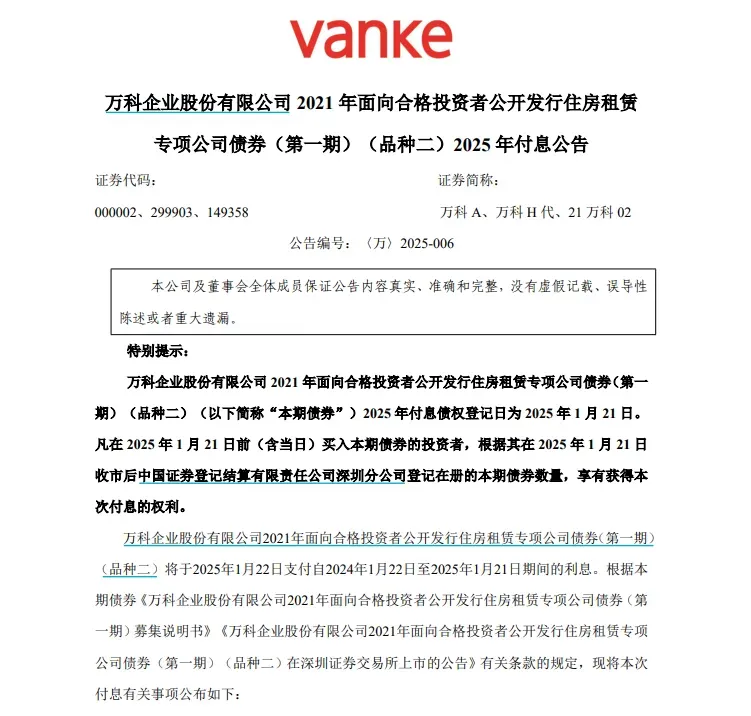 公告显示,2025年“21万科02” 年度付息债权登记日为2025年1月21日。2025年1月21日前(含当日)购买本期债券的投资者,在2025年1月21日收盘后,按照中国证券登记结算有限公司深圳分公司登记的“21万科02”债券数量,享有获得本次付息的权利。