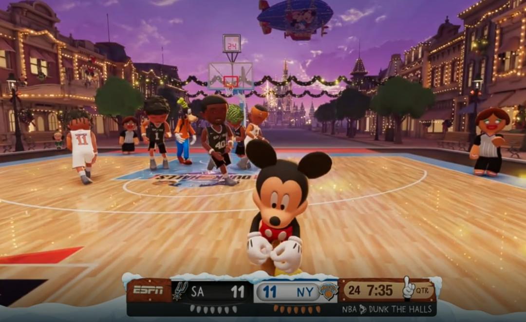 唐斯化身为高飞,保罗化身为米老鼠,布里奇斯化身为唐老鸭...在迪士尼度假区的美国大街上,与其他球员的Q版一起运球过人,投球暴扣,呈现出运动天赋。