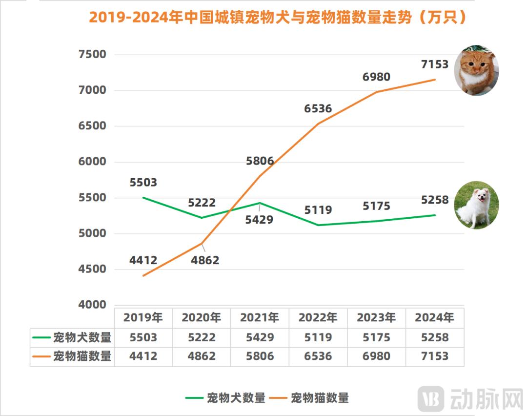 另外需要注意的是,在宠物结构中,我国城市宠物猫数量呈快速增长趋势,宠物猫数量连续四年超过宠物狗数量,2024年达到7153万只,这意味着对猫的需求正在加速。