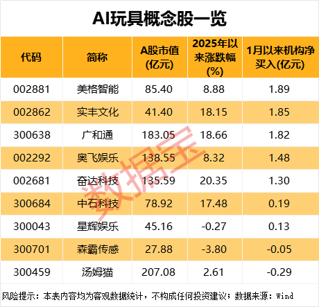 据统计,截至1月20日收盘,AI玩具概念股自今年以来均值上涨10.04%,大幅跑赢同期上证指数。从资金来看,今年以来,美格智能、丰富文化、广和通、奥飞娱乐、达达科技等5只股票净买入超过1亿元。