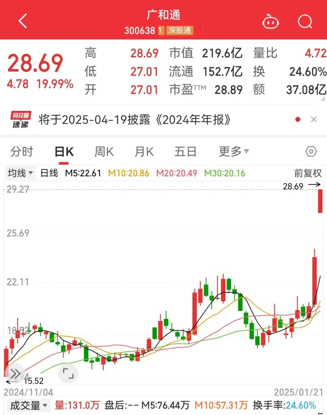 一月二十一日开盘,广和通开盘股价大幅上涨12.97%,股价自2023年以来创下新高,该股涨停板一度超过52万手。截至11:30收盘,该股开盘成交量明显,成交额超过37亿元,创下该股历史单日新高。