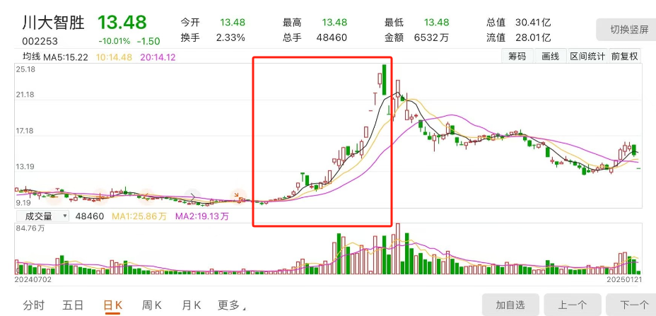 一月二十一日,川大智胜开盘跌停,报13.48元/股,总市值30.41亿元。截至发稿时,该公司股价未开盘跌停。
