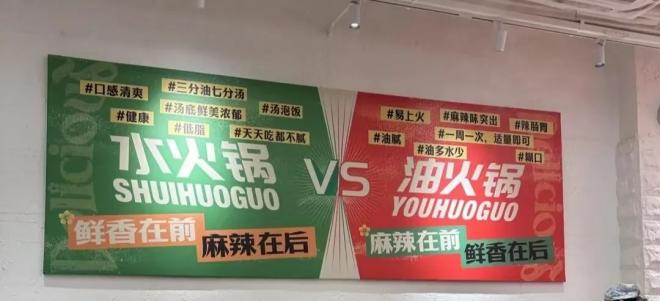 为了进一步突出卖点,宣传板重点标注了“水火锅”口感清爽”、“汤底鲜美浓郁”、每日享受而不腻”等等独特之处,以红色为代表的油火锅构成强烈对比。