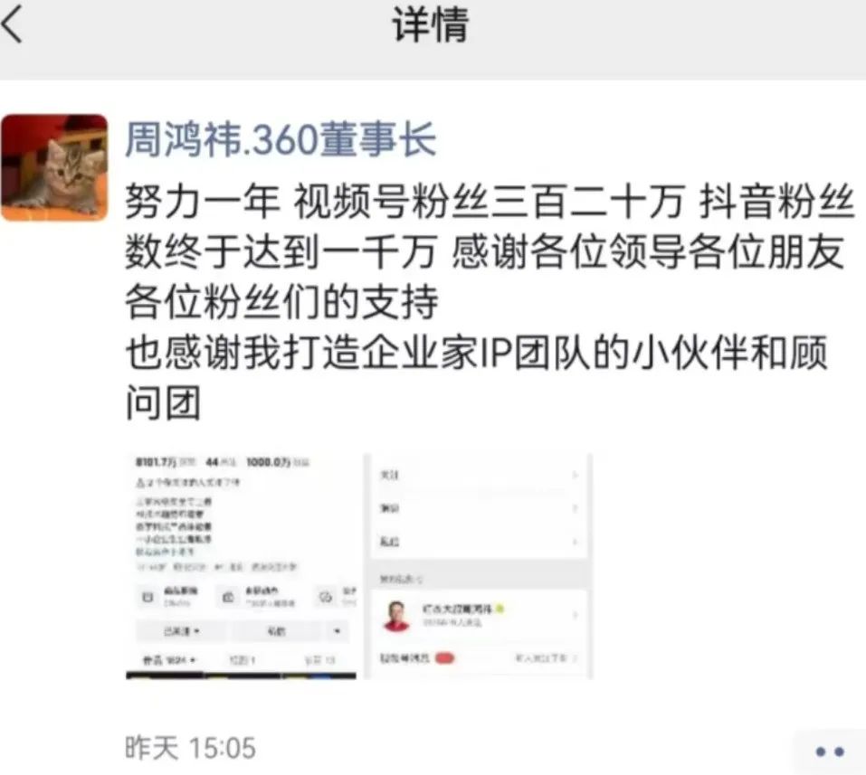 问题是流量和关注只能是一种手段,而不是最终目标。周鸿祎每天在抖音上发很多文章,幽默地评价社会话题。当然,他可以获得庞大的粉丝数量,让360更频繁地出现在公众面前。