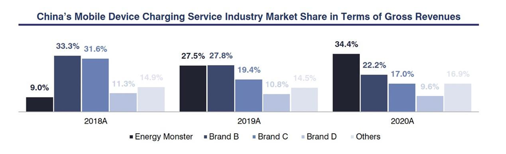 截至2020年,招股书中艾瑞咨询的行业报告显示,从2020年的市场结构来看,怪物充电从后面来,以34.4%的市场份额位居共享充电行业第一,成为中国最大的共享充电运营商。