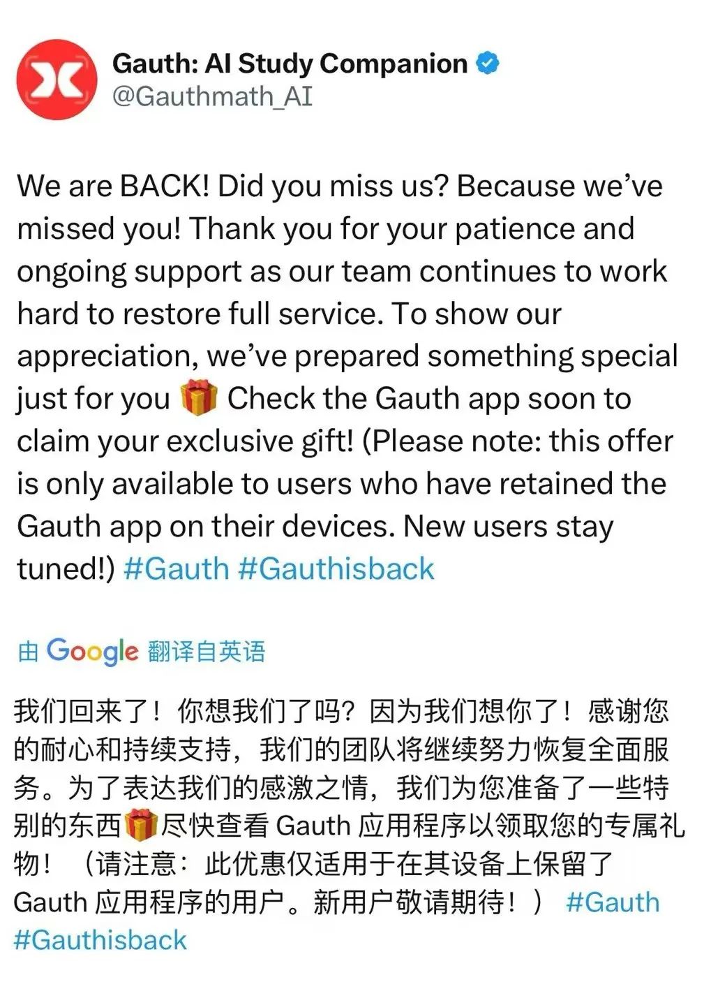 刚刚,Gauth宣布恢复美区服务:拥有3亿用户,全球考试迎来。