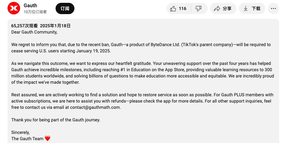 他说:“在过去的四年里,每个人都坚定地支持帮助Gauth赢得了令人难以置信的里程碑,包括在App中。 Store排名第一,为全球3亿用户提供宝贵的学习资源,解决了数十亿个问题,帮助教育公平。请放心,我们正在积极寻找解决方案,希望尽快恢复服务。”Gauth在停止服务的当天在社交平台上告诉用户。