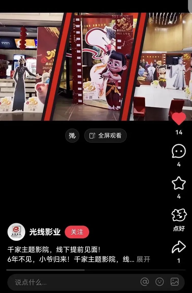 年初以来,久违的线下材料和影院营销活动接踵而至。扬州、南京、宜春等城市的影院摆出哪吒、敖丙、申公豹的人形牌,形成一个打卡点。路人可以在人形牌前停留拍照,还可以从影院获得哪吒AR卡。