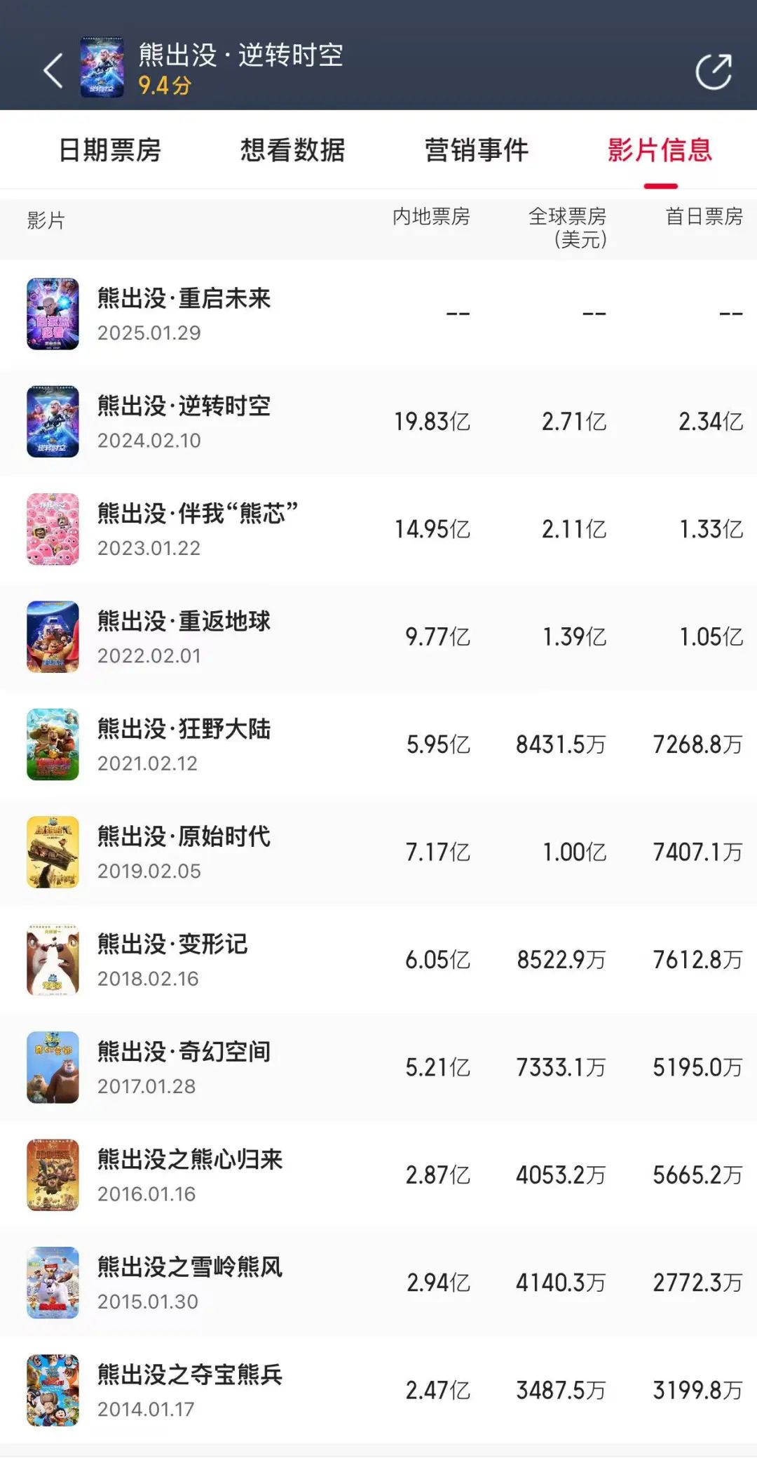 属于儿童电影《熊出没》,一般情况下,年幼的孩子至少需要成人陪伴,所以票房不容小觑。能看出这一IP的票房成绩一路大踏步前进,2024年春节《熊出没-逆转时空》票房19.83亿,比很多成年人看的电影票房都要好。今年的《熊出没与重启未来》是科幻五部曲的最后一章。它不仅在动画制作技术上不断发展,而且在内容上增加了幻想、神话、科幻等诸多元素。目前,至少儿童市场的市场相对稳定。