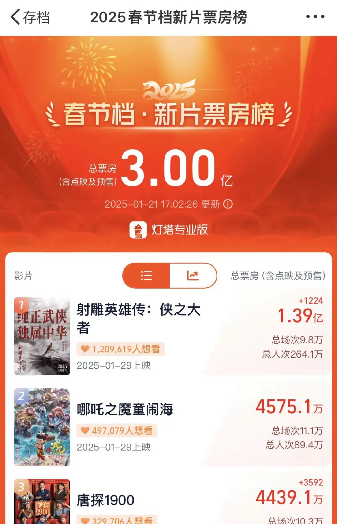 根据灯塔专业版,截至1月21日16时50分,2025年春节档上映新片预购总票房已超过3亿元。