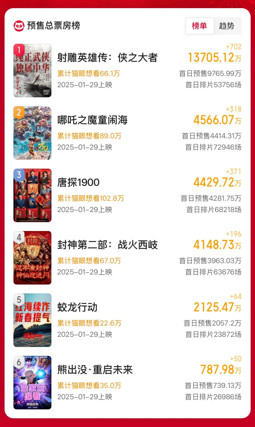 首先从预购成绩领先的《射雕英雄传:侠之大者》开始。灯塔专业版数据显示,截至1月20日,《射雕英雄传:侠客》预售票房突破1亿元,超过《唐人街探案3》刷新中国电影史春节档单片预购最快突破1亿纪录。。