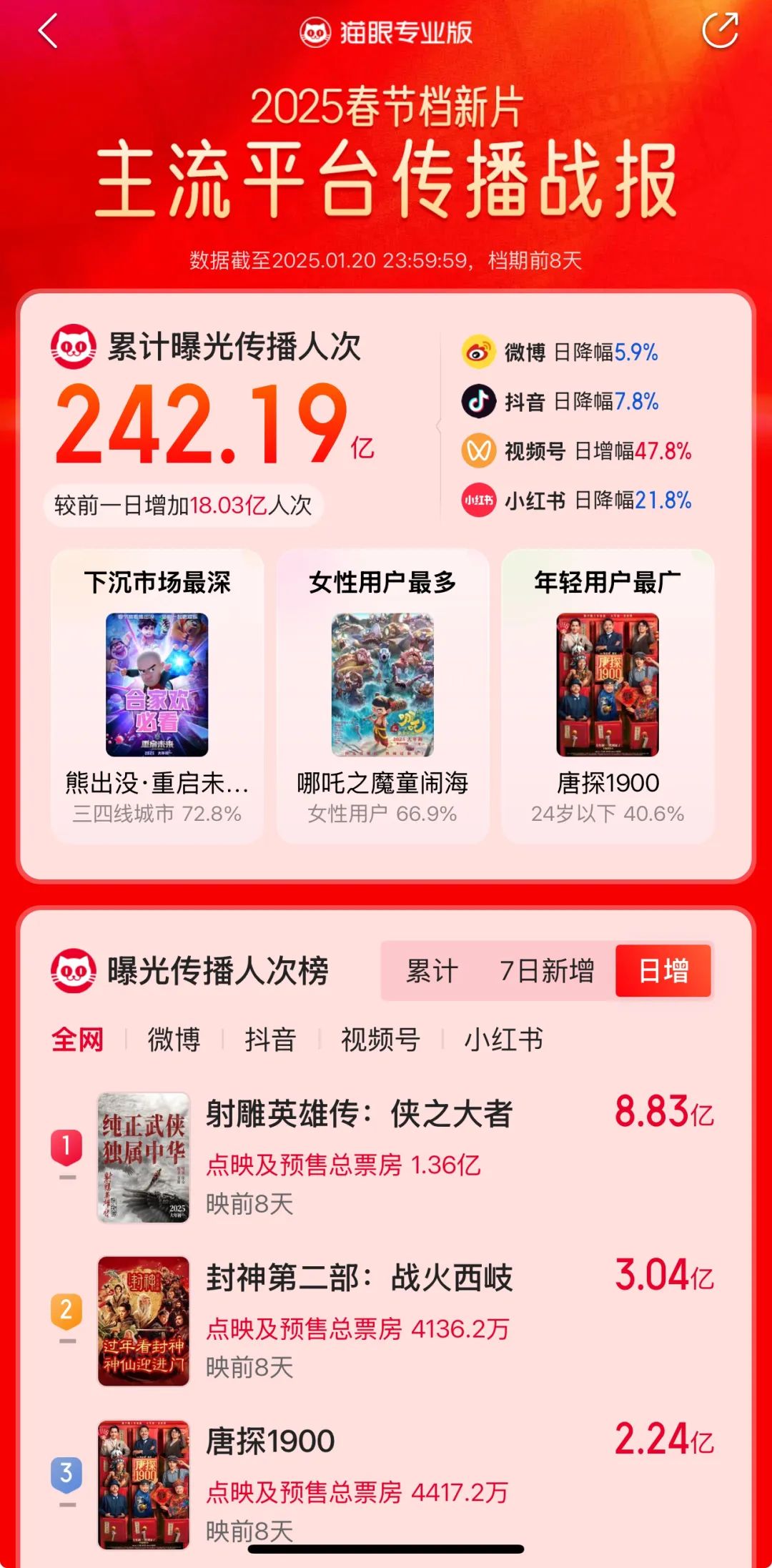 根据猫眼专业数据,今年累计在线推广曝光超过224亿人,微博、抖音、视频号、小红书是线上推广的主要渠道。。微博侧重于相关电影话题。如果Tiktok主持人分发和切片预告片短视频,视频号中会有一些电影号码进行解读,小红书会分享相关电影内容的笔记。
