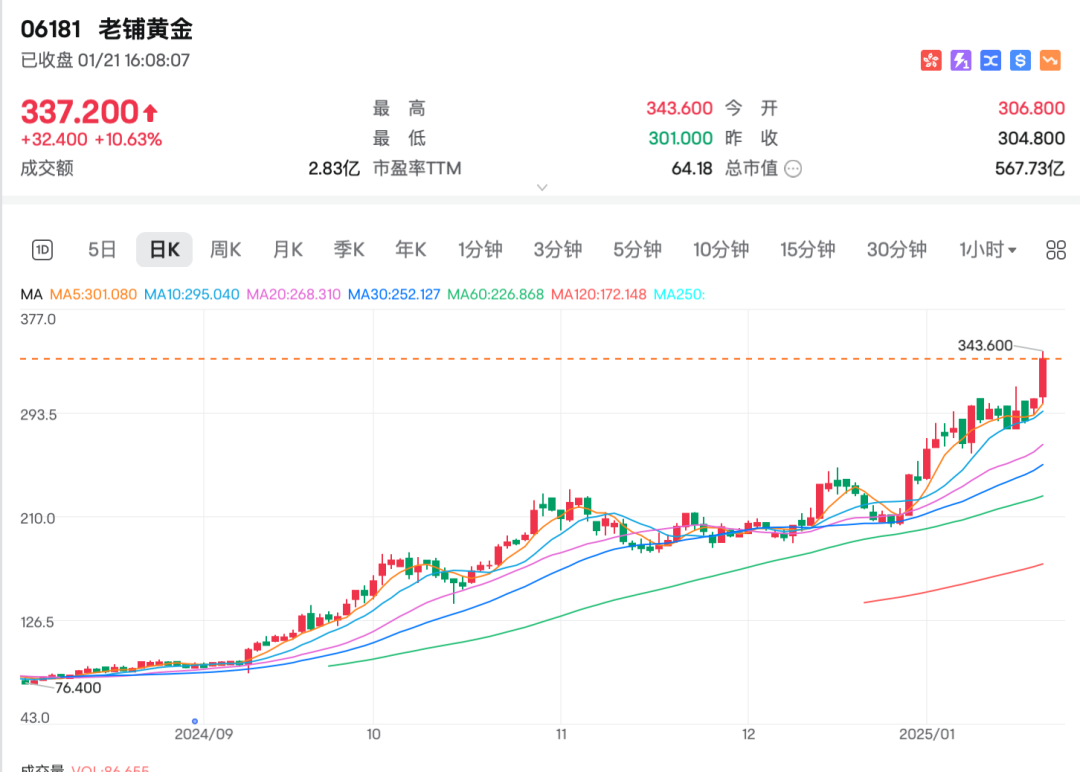老店黄金涨幅超过10%,收入337.20港元,创新高;营业额达到2.83亿港元。