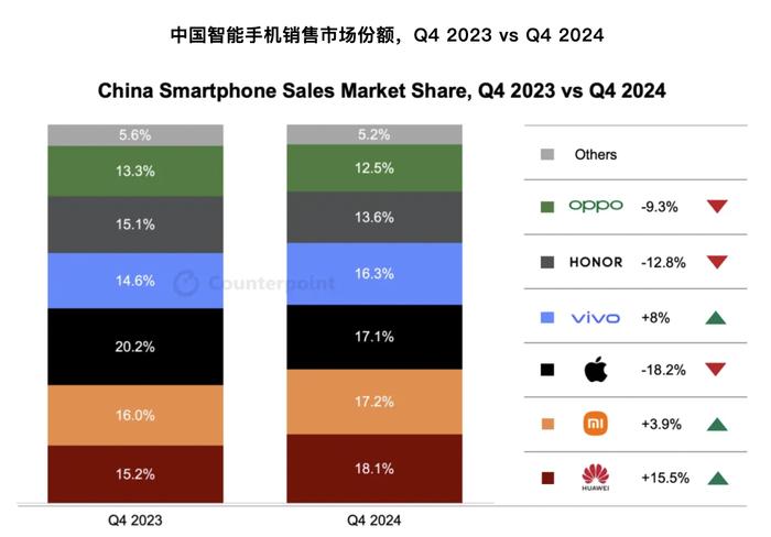 另一家数据分析机构Counterpoint在Canalys发布2024年和去年第四季度中国智能手机出货量榜单后,发布了第四季度中国智能手机销售报告。
