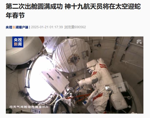据中国载人航天工程办公室消息,北京时间 2025 年 1 月 21 日 1 时 12 分,经过约 8.5 在小时的出舱活动中,神舟19号航天员蔡旭哲、宋令东、王浩泽紧密合作,在空间站机械臂和地面研究人员的配合和支持下,完成了空间站空间碎片防护装置安装、舱外设备设施检查等任务。出舱宇航员蔡旭哲、宋令东已安全返回问天实验舱,出舱活动圆满成功。