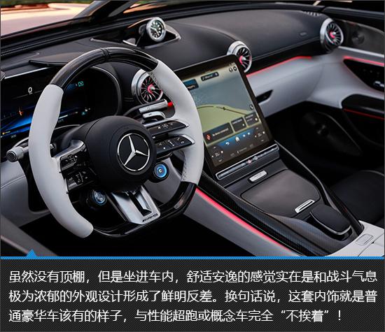 坐进车里,虽然内外只有一扇门的间隔,但梅赛德斯 -AMG PureSpeed 但仍呈现出两个完全不同的世界。其实你可以用很多修饰词来描述这个内饰的设计风格,比如精致、奢华、舒适、温馨等。然而,毫无疑问,“运动”这个词永远不会被提及。说到底也不是真正意义上的跑车,再加上开放式驾驶舱的设计已经足够激进,内饰稍微收敛一些,倒也没什么不好。