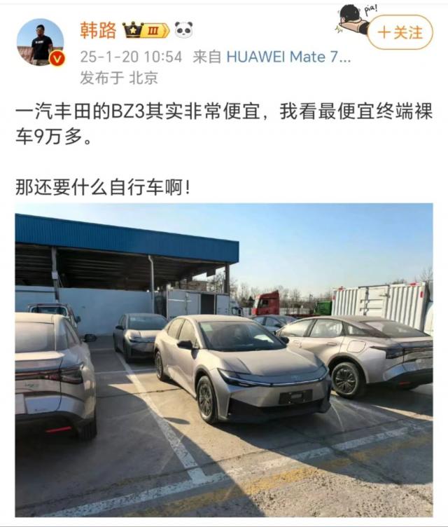 bZ3 官方指导价为 16.98 万至 19.98 近期价格跌破万元 10 一万元。这个消息是韩路,一位著名的汽车博主。 1 月 20 号码发微博称,目前一汽丰田 bZ3 最便宜的版本裸车价格已经低到了 9 万多。
