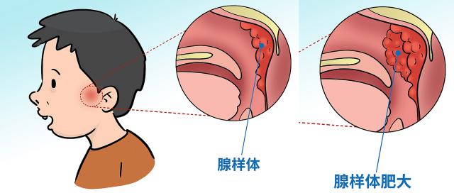 腺样体位于鼻咽穹后部。据专家介绍,如果鼻咽腺样体肥大,气流会受到限制,形成湍流,振动到软腭,形成鼾声。这样会导致孩子白天容易嗜睡,还可能导致腺样体面部上翻嘴唇,甚至影响生长发育。