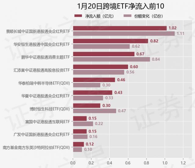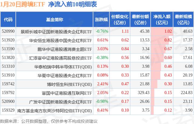 当天有 37 只跨境 ETF 资金净流入,其中景顺长城中证国新港股通央企净流入排名第一。 ETF(520990),份额增加 1.11 十亿份,净流入额为 1.02 亿元。