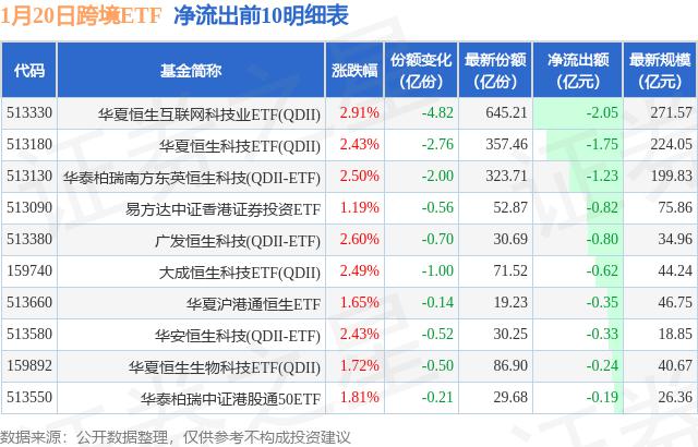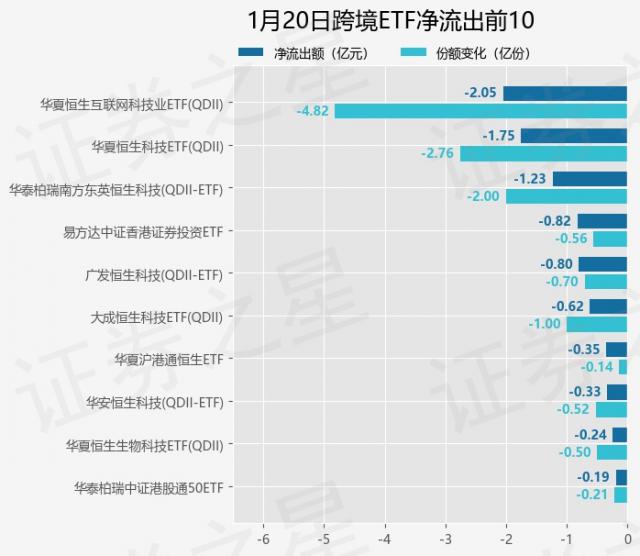 当天有 34 只跨境 ETF 资金净流出,其中华夏恒生互联网科技行业净流出排名第一。 ETF ( QDII ) (513330),份额下降 4.82 一亿份,净流出额为 2.05 亿元。