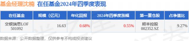 交银瑞思由沈楠管理 LOF 基金在 20 年 3 季度买入顺丰控股,已连续拥有。 4 年又 1 每个季度。有期的估计收益率为 -在此期间,顺丰控股有47.08%。 2020 年至 2024 年中报业务总收入增长达到 88.97%。