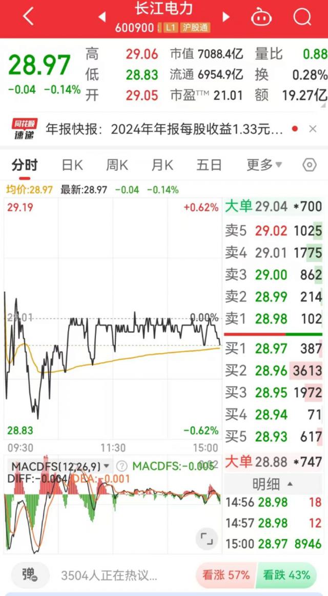 截至 1 月 20 日收盘,长江电力收盘下跌。 0.14%,报 28.97 元 / 股,总市值 7088.4 亿元。