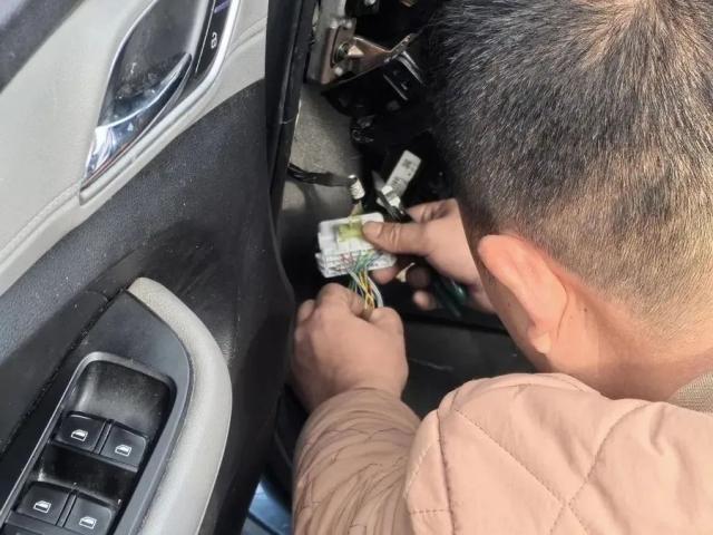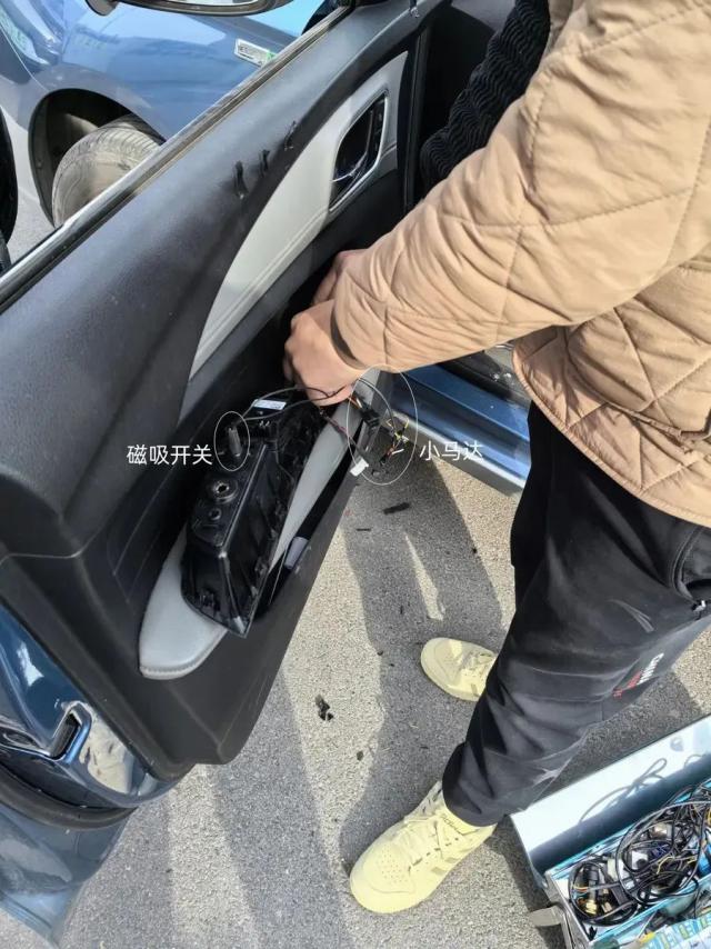 下一步是最重要的“小马达”安装阶段。在确定记者选择将“小电机”的感应位置放在门扶手的前端后,“小米”将门扶手拆开,在扶手盖板的储物格背面安装了一个黑色的圆柱形设备,里面有两根电缆。然后,“小电机”一端的电路板贴在门扶手盖板的前面,几根电缆一根一根地与门扶手内插座上的电缆连接。也就是说,“小马达”的所有设备都安装在门扶手盖板的背面,一旦盖板安装恢复,从外观上完全看不见。