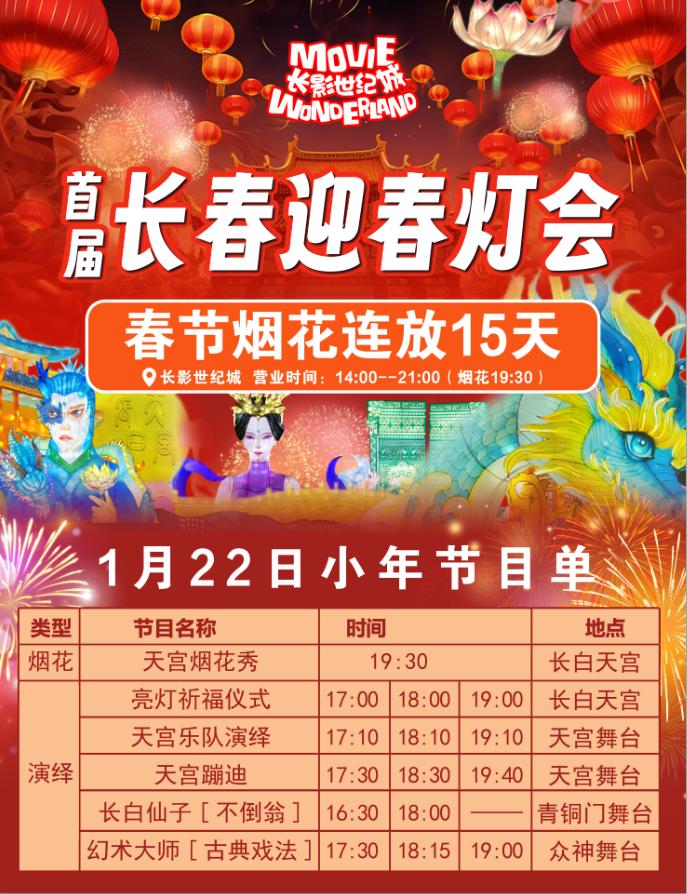 长影世纪城策划建设的“长春迎春灯会”由近百组华丽的灯笼组成。春节假期期间,每天晚上都会上演一个仪式感十足的春节祈福灯笼仪式,还会有“五路财神”“长白仙女”“不倒翁女神”。、鱼灯车巡游、音乐会、蹦迪、爱情冷焰火等活动。值得注意的是,蛇年正月初一至十五,大型烟花秀将连续15天。