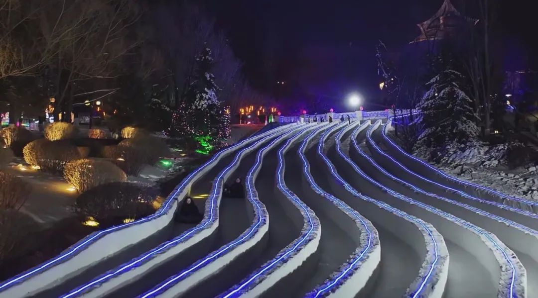 除了赏灯看烟花,游客还可以感受到131.4米雪滑梯,在高处快速滑下。风在耳边咆哮,雪在身边飞舞。你可以玩一次,停不下来!