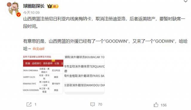 在尼日利亚内线注册山西男篮奥梅纳卡,取消迪亚洛注册,后者返美陪产,要暂时缺阵一段时间。
