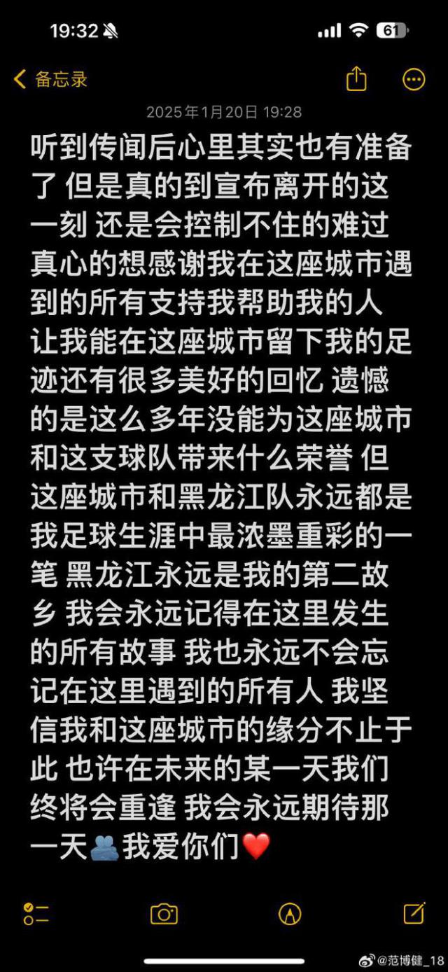 昨天,中国足协宣布黑龙江冰城俱乐部注册会员协会改为江西后,黑龙江冰城球员范博健在社交媒体上发布消息称:“黑龙江永远是我的第二故乡,我永远记得这里发生的所有故事。”