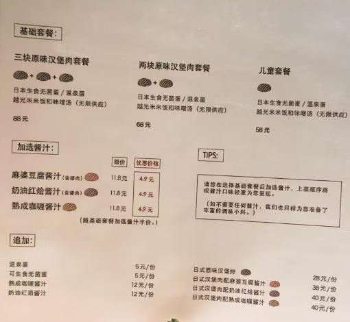 它们以日式牛肉汉堡肉为招牌,结合六种酱料,温泉蛋,西蓝花,黄瓜,味增汤等,以套餐的形式出售。