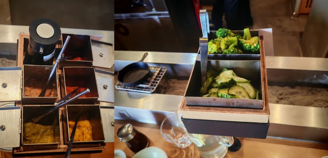 餐具、餐垫、配菜和酱料都夹在客户餐桌上相应的个人抽屉里,也节省了独立的员工服务,半自助也节省了人工成本。