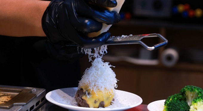 顾客可以看到整个过程,从肉馅中绞碎和烘烤:整个上脑肉被绞碎,由厨师拍打成型,然后烘烤约5-7分钟,然后夹在顾客面前的加热板上。
