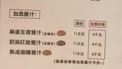 而且如果顾客觉得味道还是单一的话,一些品牌还加入了付费酱,比如麻婆豆腐酱、奶油红焖酱、熟咖喱酱等。