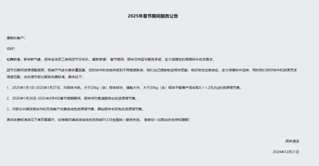 其中,顺丰快递宣布:1 月 1 日 -1 月 27 日,顺丰卡航,大于顺丰卡航, 顺丰快递标快20kg(含),填舱大件,大于 20kg(含)顺丰干配等商品收费 0.1 元 -1.2 元 /kg 资源调节费用。1 月 28 日 -2 月 4 春节假期期间,顺丰快递将为寄递服务增加资源调节费。