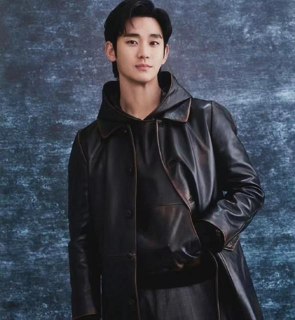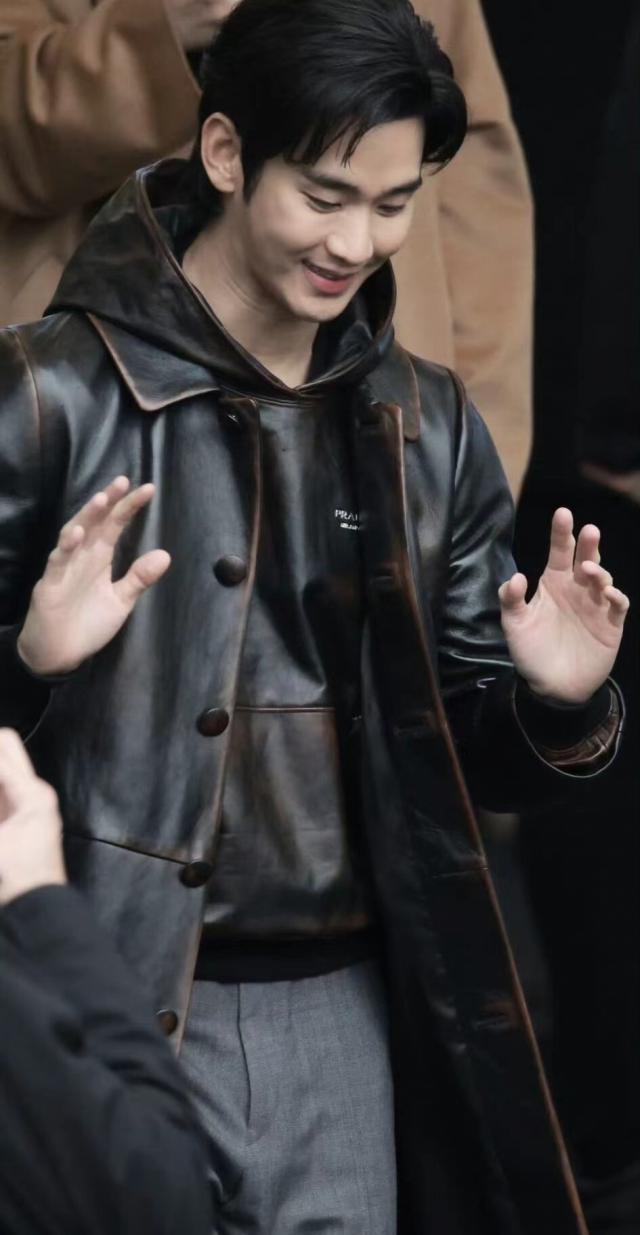 然而,金秀贤的时尚感得到了很好的控制。皮质毛衣搭配皮质风衣,同色系的厚底皮鞋,简约的灰色裤子,看起来轻松随意。