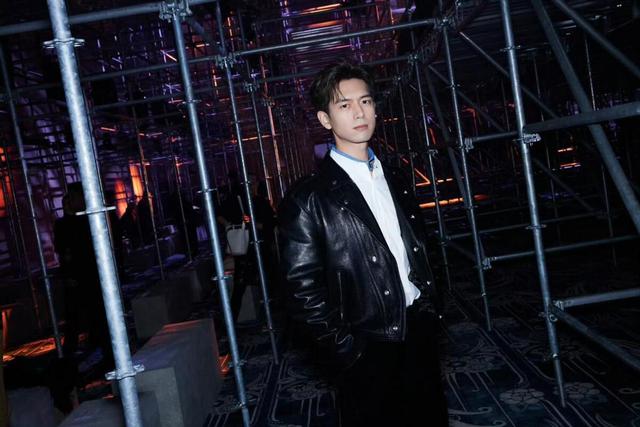 作为代言人,李现也有自己的风格。白衬衫搭配黑色皮衣外套,搭配黑色直筒裤和皮鞋,领口戴着蓝色围巾。