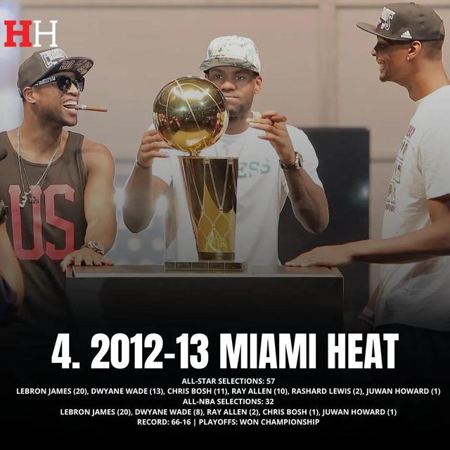 那时的热火,拥有勒布朗詹姆斯,韦德和波什,已是 NBA 最佳超级明星球队。接着加入了雷阿伦等优秀球星,在常规赛中获胜。 66 胜 16 负面记录,在总决赛中击败马刺,拿下马刺。 NBA 冠军。