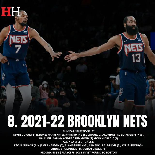 2021-22 布鲁克林篮网这个赛季真的很可惜。凯文杜兰特、凯里欧文、德拉蒙德、詹姆斯哈登、阿尔德里奇、格里芬、德拉季奇等人处于巅峰时期,但由于伤病和疫情问题,他们只在常规赛中获胜。 44 胜 38 失败的记录。虽然进入了季后赛,但是在第一轮就输给了波士顿凯尔特人。