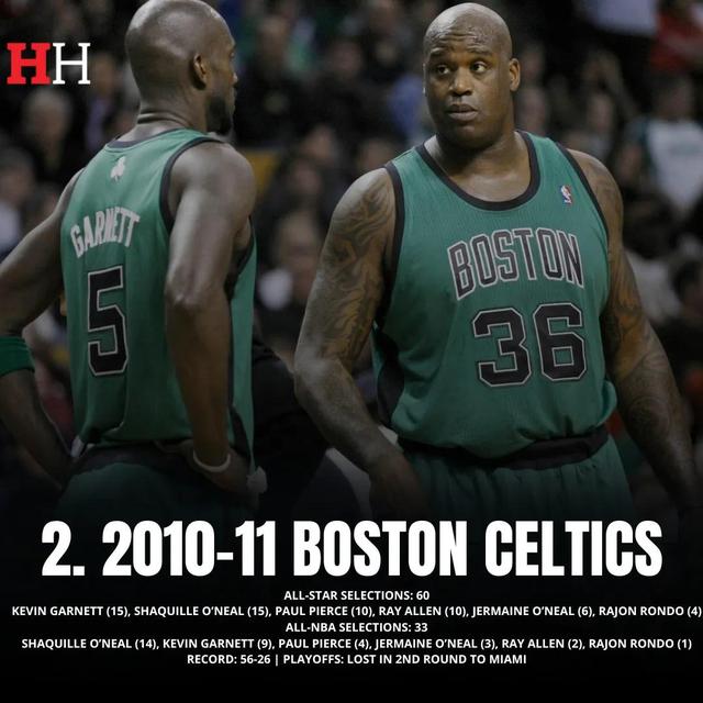 2010-11 本赛季,凯尔特人继续保持以凯文加内特、雷阿伦、保罗皮尔斯和拉简朗为首的四巨头阵容。他们还赢得了沙奎尔奥尼尔,这可以算是更加强大了。常规赛 56 胜 26 这是一个令人印象深刻的记录,但季后赛在第二轮被迈阿密热火三巨头淘汰!当时,热火创造了以勒布朗詹姆斯、韦德和波什为首的三巨头。